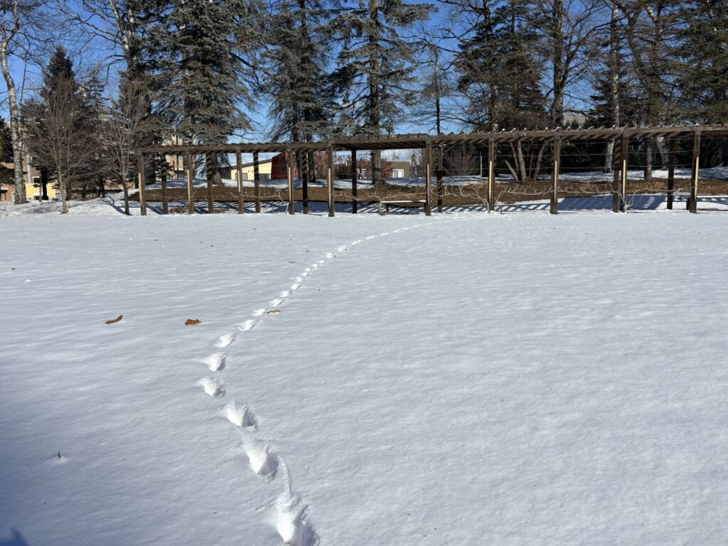 雪の日のあとにまっすぐに伸びる足跡がありました。この特徴的な足跡はキタキツネの足跡です!