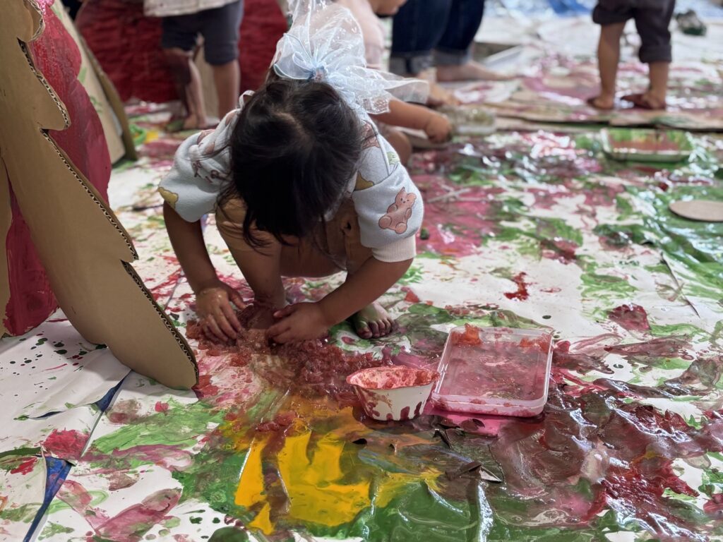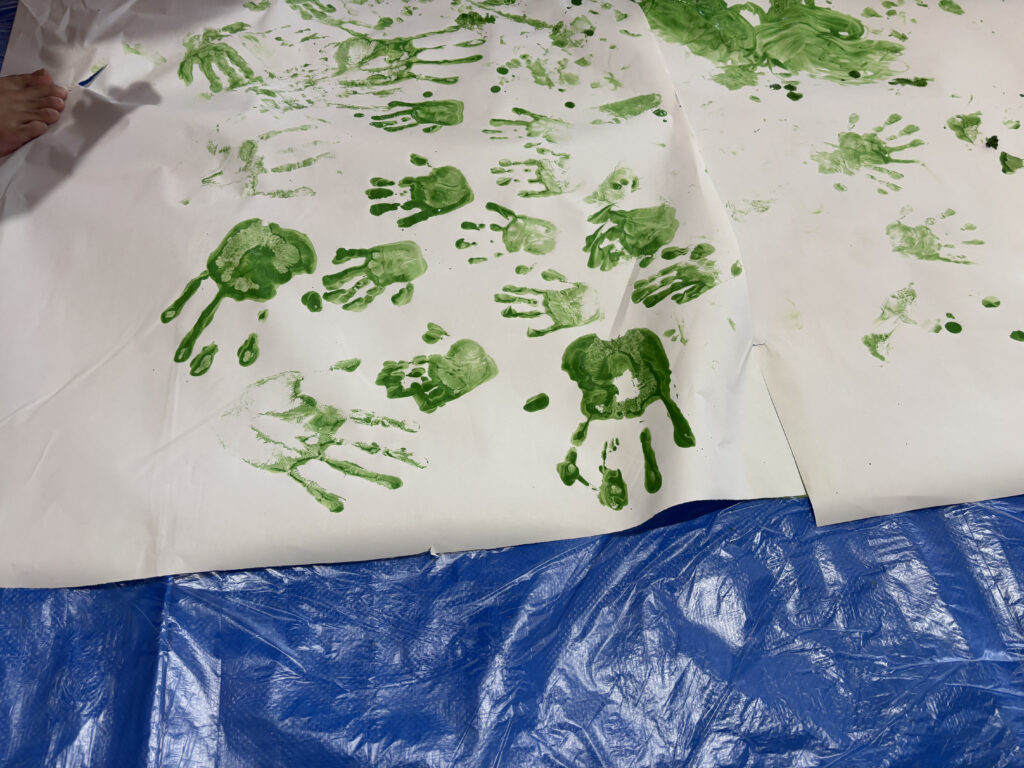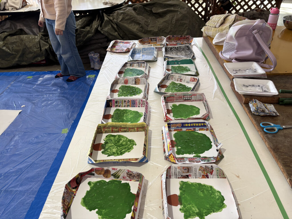ひとりひとつのクリスマスツリーに色付けしました。おうちで飾れるように飾り付けも用意してもらいました!絵の具を混ぜて色を変えてみたり…寒天の感触を手で確かめたり…それをキャンバスに塗ってみたり。五感の刺激を感じながらあそびました!
