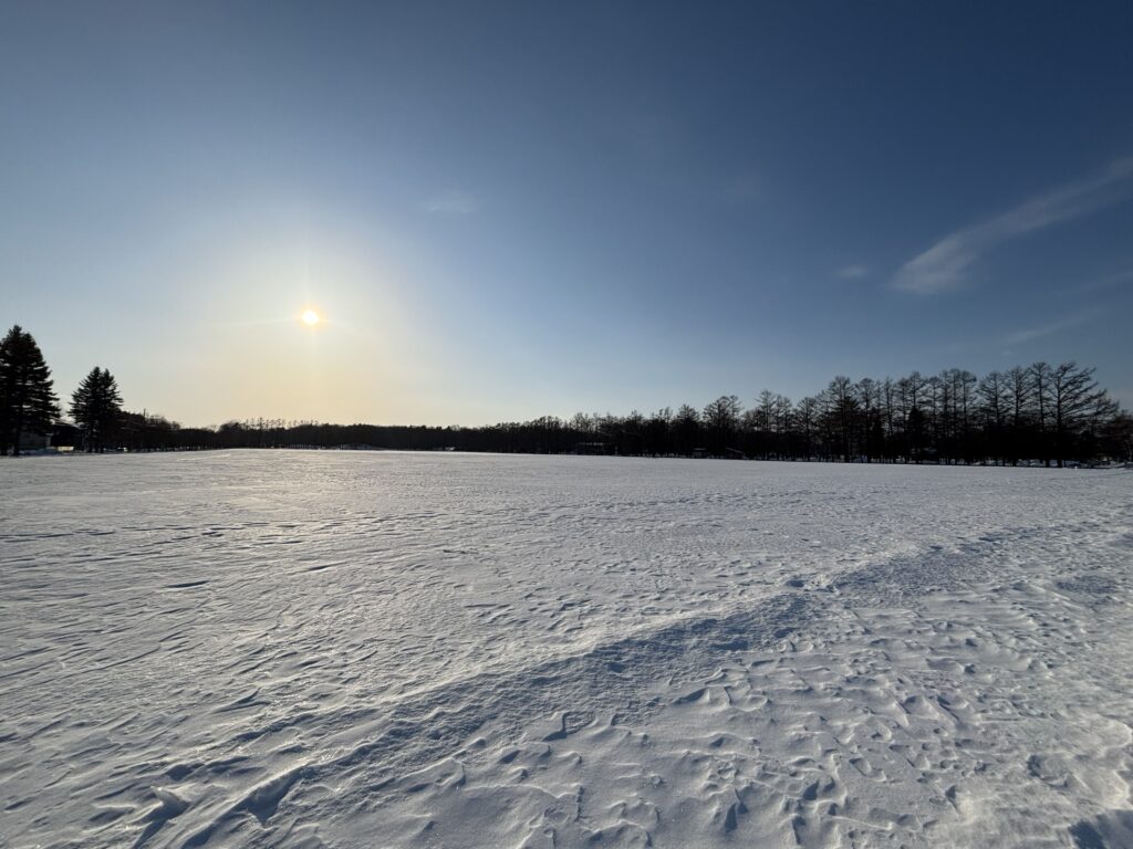 広い雪面と広い青空の下で深呼吸すると気持ちいいですよ。