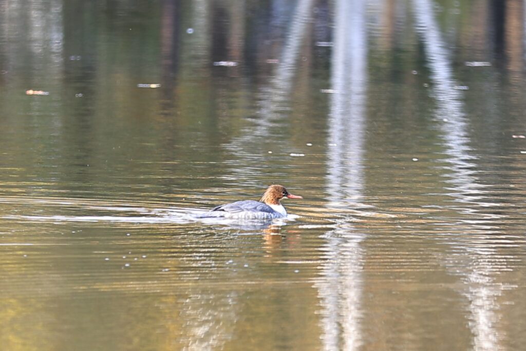 池にはカワアイサの一家がやってきています。頭から首にかけてと胴体がはっきりと色が分かれていて、襟足が長いのが特徴です。