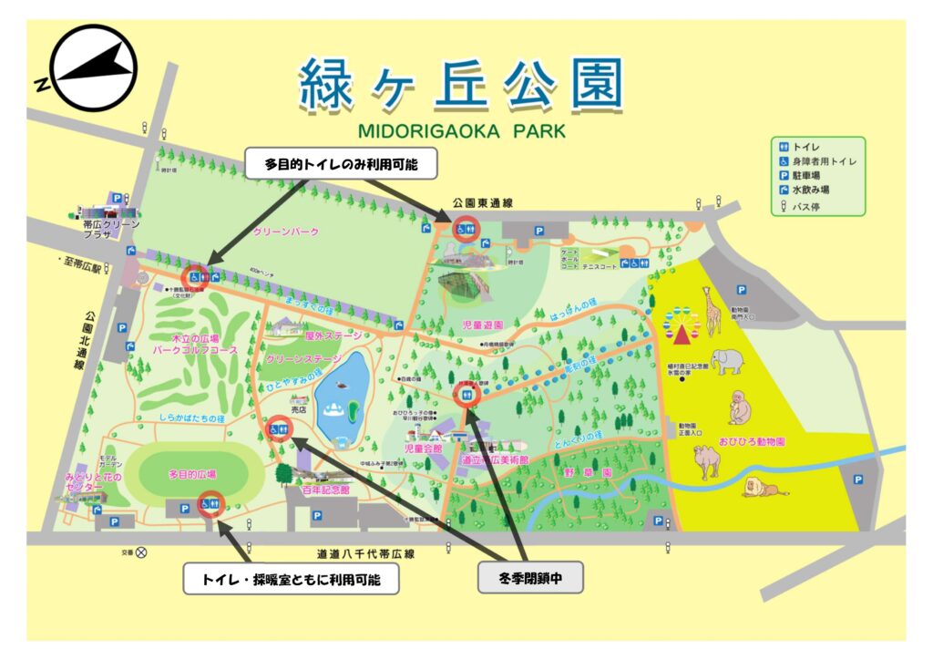 ・グリーンパーク、児童遊園の多目的トイレおよび多目的広場のトイレ・採暖室の3箇所は引き続きご利用いただけます。※美術館横トイレおよび売店横トイレは4月まで閉鎖しています。