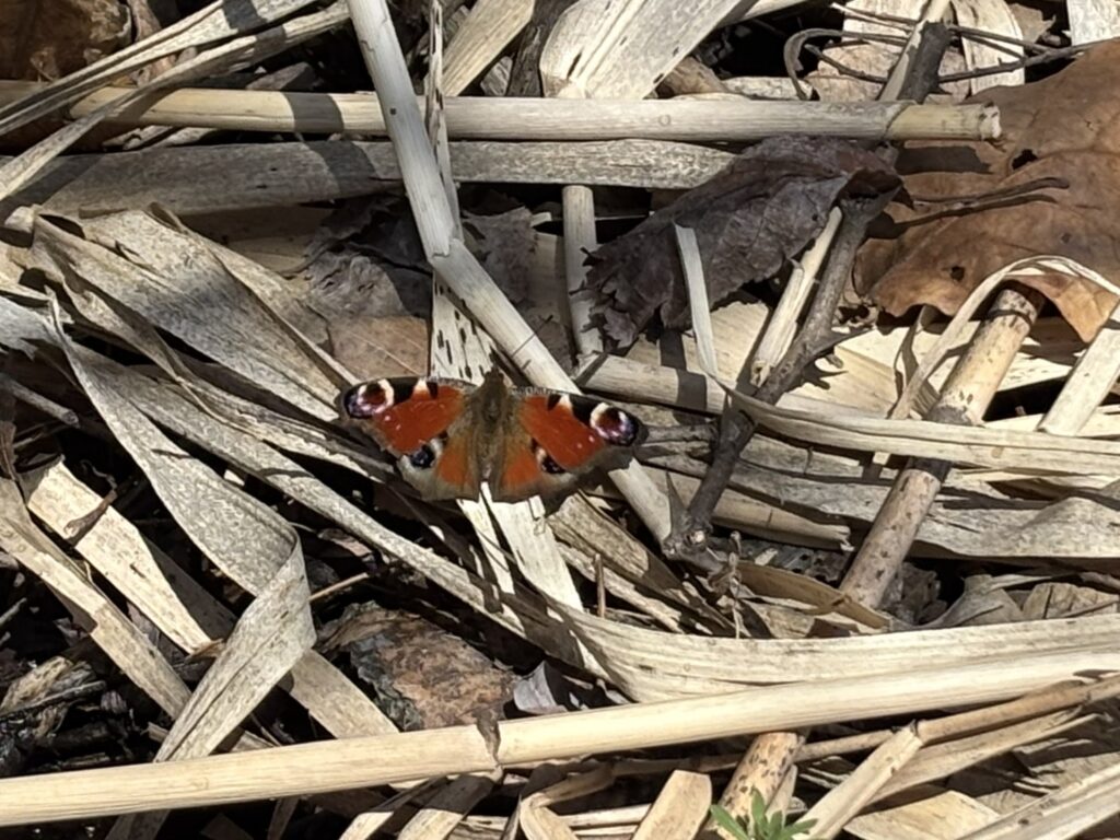 特徴的な目玉模様の羽は「クジャクチョウ」。成虫の状態で冬を越し、残雪が残る時期の暖かい日にも飛ぶことがあります。
